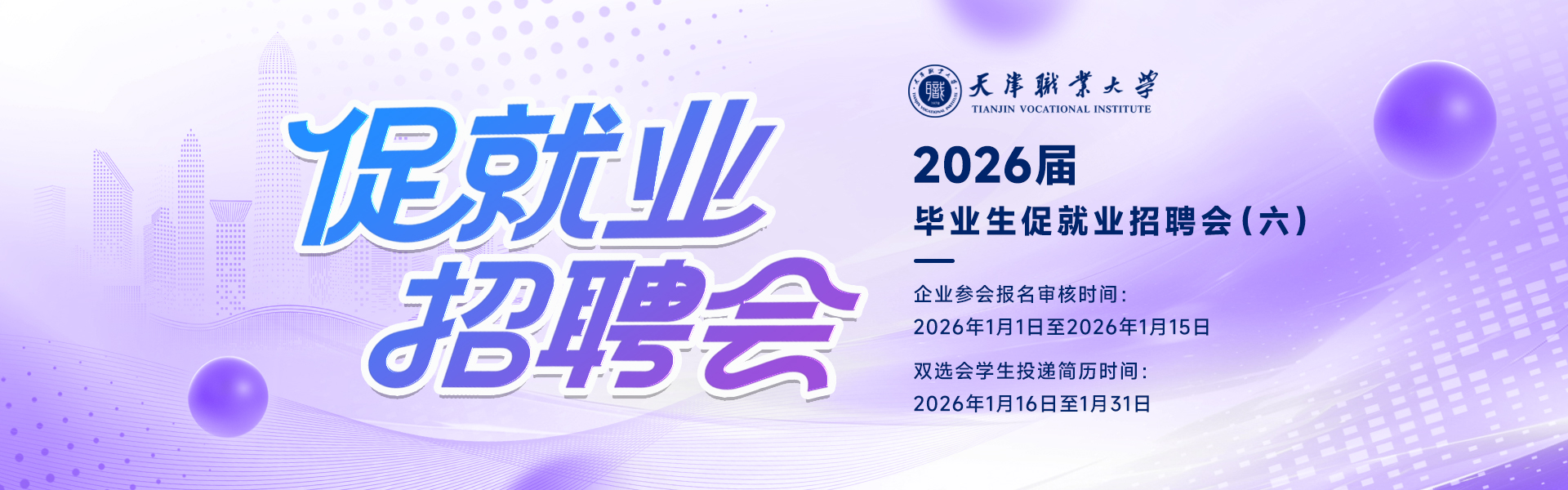 为深入贯彻党中央、国务院关于高校毕业生就业工作的决策部署,满足用人单位招才引智需求,为我校学生拓宽就业渠道,促进广大用人单位和高校毕业生之间的交流,实现招聘和求职的有效对接,天津职业大学2026届毕业生促就业招聘会(六),诚挚邀请各用人单位来我校选录毕业生,我们将竭诚为您服务,具体安排如下: